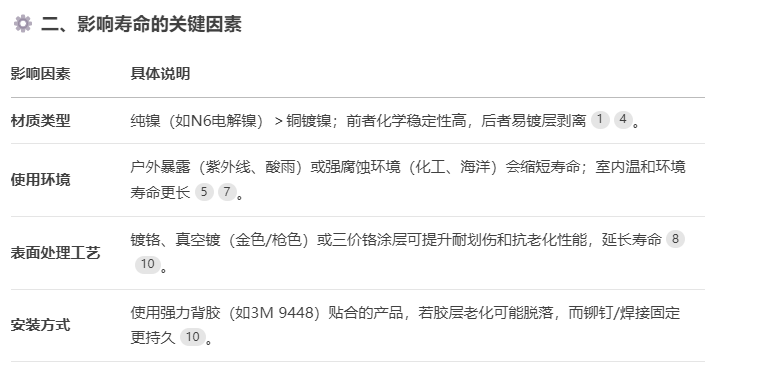 優(yōu)先選擇≥99%純鎳材質(zhì) + 表面鍍鉻/真空鍍工藝 + 強力背膠或機械固定,以最大化耐久性。